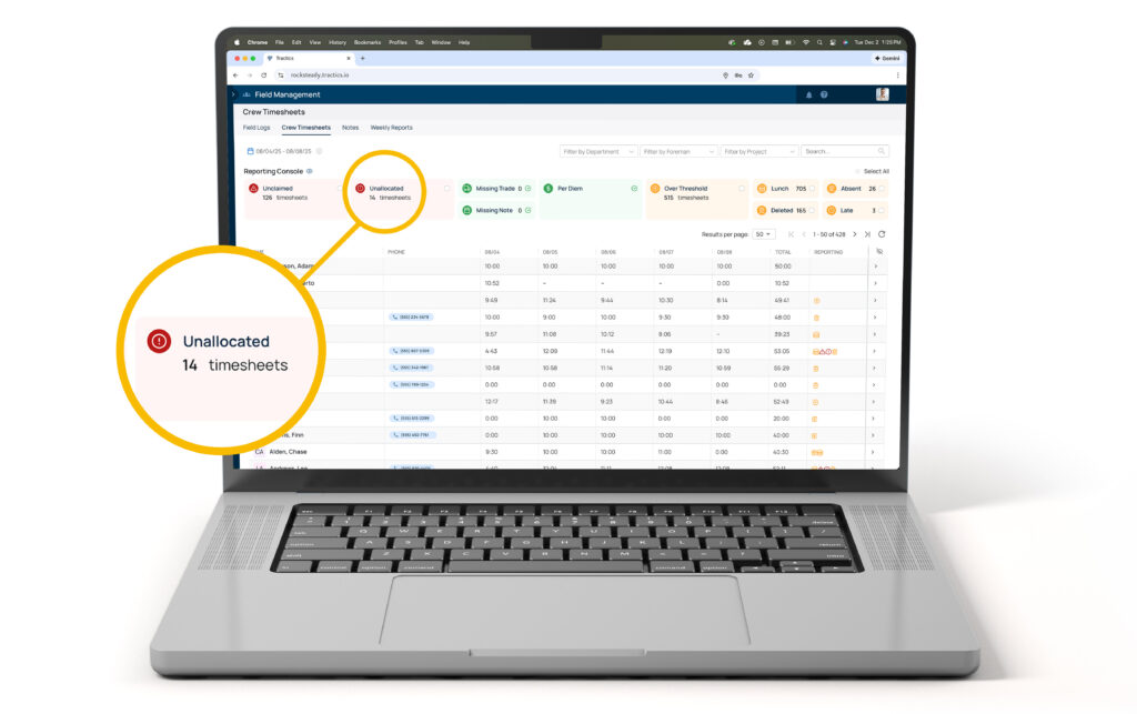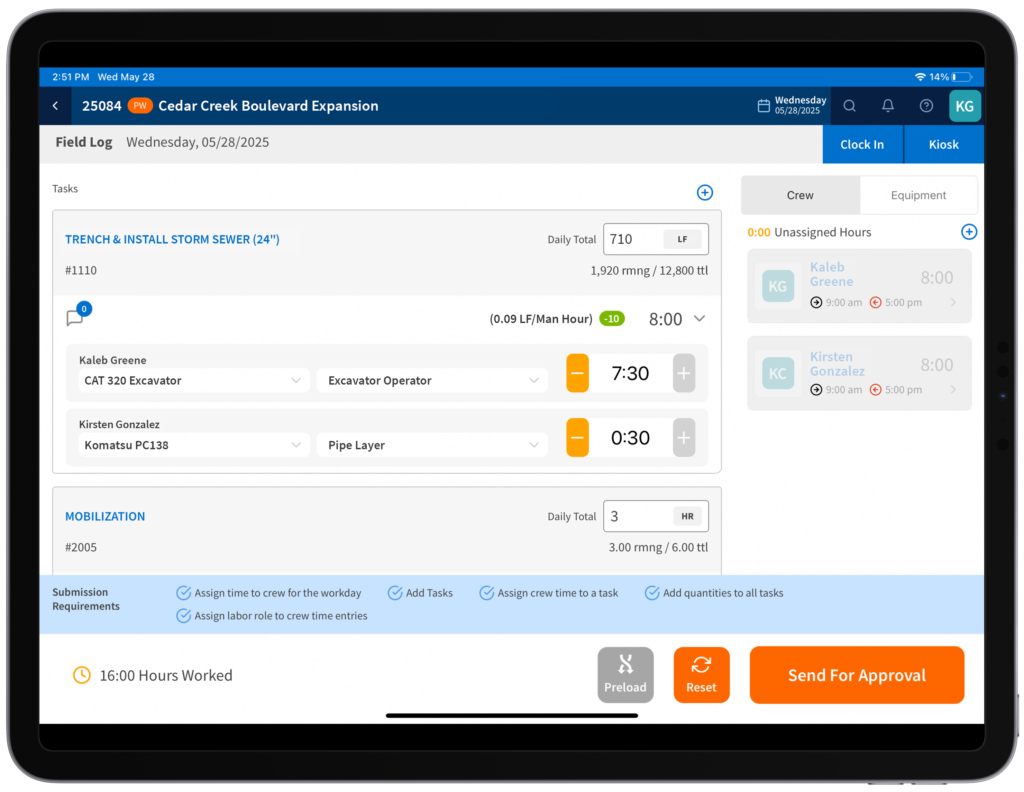 - Time and quantities flowing straight from the field into your logs, dailies, and payroll reports